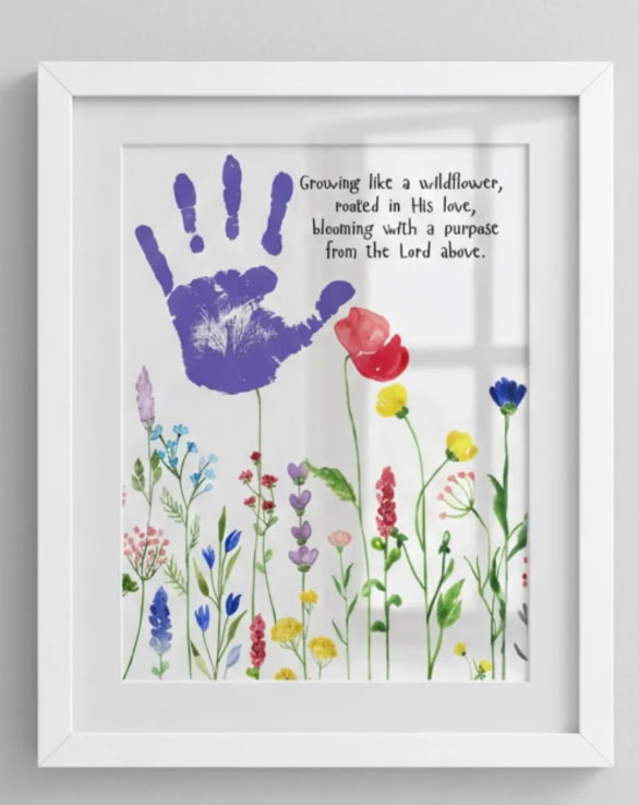 This one has the feeling of being an actual painting! The grass and flower stems blend seamlessly with the handprints, giving it a life-like feel! The poem and Bible verse add a heartfelt touch!